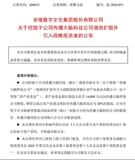 浙數(shù)文化公告,控股子公司傳播大腦科技公司擬增資擴(kuò)股并引入戰(zhàn)略投資者浙江省產(chǎn)業(yè)基金,省產(chǎn)業(yè)基金擬以現(xiàn)金人民幣1.4億元向傳播大腦科技公司增資,增資完成后將持有傳播大腦科技公司20%的股權(quán)。...