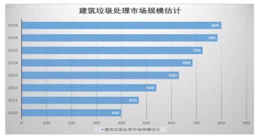 2017年我國(guó)建筑垃圾處理市場(chǎng)的體量已經(jīng)超過(guò)800億元,相較于2010年400億元,翻了一番,8年內(nèi)的平均增長(zhǎng)率超過(guò)10%。中國(guó)環(huán)保在線判斷,維持現(xiàn)有的增長(zhǎng)率,到2020年,我國(guó)建筑垃圾處理市場(chǎng)規(guī)??梢暂p松突破1000億大關(guān)。還有機(jī)構(gòu)預(yù)測(cè),到2030年,我國(guó)建筑垃圾能夠帶來(lái)的產(chǎn)值將超過(guò)3300億元。