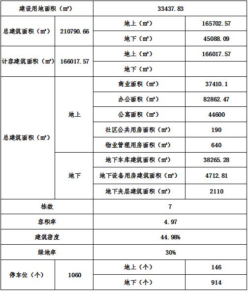 項(xiàng)目用地面積為33437.83㎡,總建筑面積210790.66㎡,其中地上建筑面積165702.57㎡,地下建筑面積45088.09㎡;計(jì)容建筑面積166017.57㎡,建筑密度44.98%,容積率4.97,綠地率30%。規(guī)劃停車位共計(jì)1060個(gè);地上146個(gè),地下車位914個(gè)。