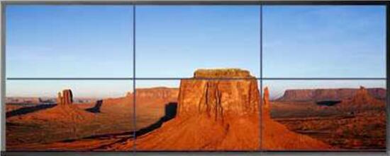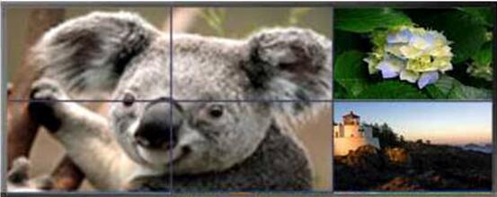 如上圖,每個(gè)液晶單元可以單獨(dú)顯示一路電腦畫(huà)面或監(jiān)控錄像等圖像格式,每個(gè)單元顯示的信號(hào)可任意切換。組合拼接顯示: