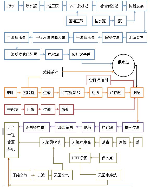 果茶飲料(液體)生產(chǎn)線建有一條,占地面積4500平方米,主要生產(chǎn)原料為濃縮茶汁、水、白砂糖、食品添加劑。其中生產(chǎn)流程圖如下: