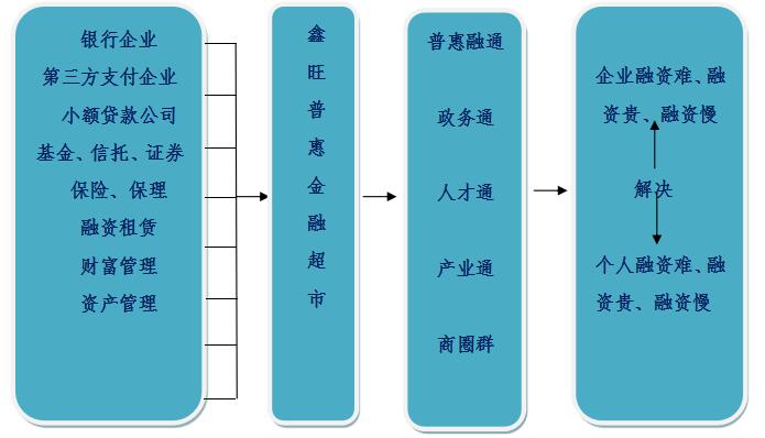 項目模式可簡單闡述為:以山東鑫旺集團為依托,通過(某某市)鑫旺普惠金融超市,整合當?shù)亟鹑跈C構(gòu),為當?shù)貍€人、中小企業(yè)提供免費咨詢、培訓、專業(yè)指導、金融貸款產(chǎn)品對接等金融服務,從而解決企業(yè)融資難、融資貴、融資慢難題。最終實現(xiàn)直接盤活地方經(jīng)濟、增加地方稅收、增加地方就業(yè)、等民生問題,并有利于解決地方引進各大行業(yè)專業(yè)人才,提高地方政治、經(jīng)濟地位。