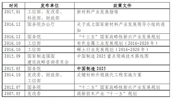 為深化落實(shí)《中國(guó)制造2025》,一方面2017年1月工信部等四部委發(fā)布的《新材料產(chǎn)業(yè)發(fā)展指南》作為我國(guó)歷史上首個(gè)針對(duì)材料產(chǎn)業(yè)發(fā)布的產(chǎn)業(yè)發(fā)展指南,則是“十三五期間”指導(dǎo)新材料產(chǎn)業(yè)發(fā)展的核心綱領(lǐng)性文件;另一方面,國(guó)務(wù)院及各部委制定的新材料相關(guān)領(lǐng)域的“十三五”規(guī)劃則是明確《中國(guó)制造2025》及新材料中長(zhǎng)期發(fā)展愿景在“十三五”期間的發(fā)展任務(wù)和目標(biāo),其中以2016年12月國(guó)務(wù)院發(fā)布的《“十三五”國(guó)家戰(zhàn)略性新興產(chǎn)業(yè)發(fā)展規(guī)劃》為首,同時(shí)也涵蓋2016年10月工信部發(fā)布的《有色金屬工業(yè)發(fā)展規(guī)劃》和《稀土行業(yè)發(fā)展規(guī)劃》的相關(guān)內(nèi)容。