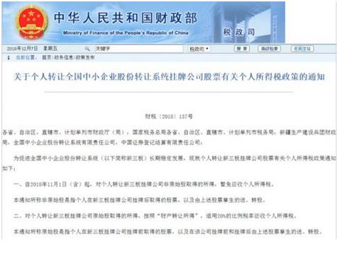 財(cái)稅〔2018〕137號(hào) 各省、自治區(qū)、直轄市、計(jì)劃單列市財(cái)政廳(局),國(guó)家稅務(wù)總局各省、自治區(qū)、直轄市、計(jì)劃單列市稅務(wù)局,新疆生產(chǎn)建設(shè)兵團(tuán)財(cái)政局,全國(guó)中小企業(yè)股份轉(zhuǎn)讓系統(tǒng)有限責(zé)任公司,中國(guó)證券登記結(jié)...