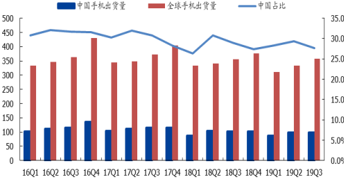 圖表 2-21:中國及全球手機出貨量,以及中國占比情況(百萬部)