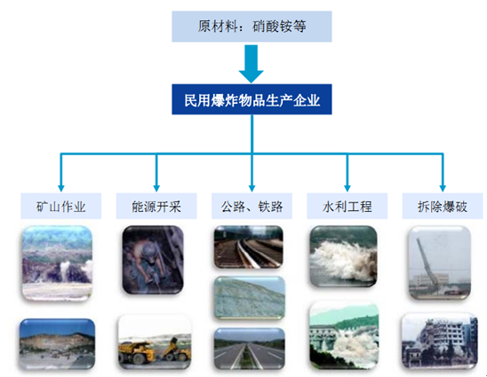 民爆器材是各種用于非軍事目的的工業(yè)炸藥及起爆器材的總稱,常用的工業(yè)炸藥有銨油炸藥、水膠炸藥、乳化炸藥。民爆行業(yè)上游為生產(chǎn)所需的基礎化工原料,下游則是煤炭、金融、非金融等礦山開采,以及鐵路、公路、水利等基礎設施建設。