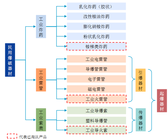 工業(yè)炸藥是指用于采礦和工程爆破等作業(yè)的炸藥; 工業(yè)雷管是指在管殼內(nèi)裝有起爆藥和猛炸藥的工業(yè)火工品; 工業(yè)索類火工品是指具有連續(xù)細長裝藥的索狀工業(yè)火工品的總稱。3大類民爆器材的主要產(chǎn)品如下圖所示: