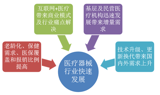 我們認為在行業(yè)整合和進口替代加速的趨勢下,人口老齡化(保健消費需求升級)、互聯(lián)網(wǎng)+醫(yī)療帶來商業(yè)模式及行業(yè)痛點解決、基層及民營機構(gòu)發(fā)展以及技術(shù)創(chuàng)新升級將是直接拉動醫(yī)療器械行業(yè)加速發(fā)展的四輛馬車。