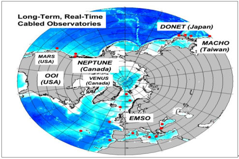 目前世界上已經(jīng)初步建成或在建的較大規(guī)模觀測網(wǎng)主要有:歐洲ESONET/EMSO、美國OOI、加拿大ONC(由VENUS與NEPTUNE組成)、日本DONET、及我國臺灣MACHO等。其中,前三個(gè)項(xiàng)目用于海洋探索及多學(xué)科研究,DONET及MACHO項(xiàng)目則主要用以地震監(jiān)測和海嘯預(yù)警。