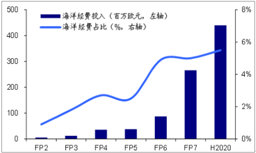 歐盟FP計(jì)劃海洋領(lǐng)域經(jīng)費(fèi)投入情況(百萬歐元)