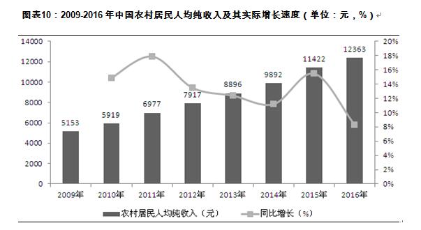 2016年全國(guó)居民人均可支配收入23821元,比上年增長(zhǎng)8.4%,扣除價(jià)格因素,實(shí)際增長(zhǎng)6.3%;全國(guó)居民人均可支配收入中位數(shù)20883元,增長(zhǎng)8.3%。2016年,農(nóng)村居民人均可支配收入12363元,比上年增長(zhǎng)8.2%,扣除價(jià)格因素,實(shí)際增長(zhǎng)6.2%;農(nóng)村居民人均可支配收入中位數(shù)11149元,增長(zhǎng)8.3%。城鎮(zhèn)居民人均可支配收入33616元,比上年增長(zhǎng)7.8%,扣除價(jià)格因素,實(shí)際增長(zhǎng)5.6%;城鎮(zhèn)居民人均可支配收入中位數(shù)31554元,增長(zhǎng)8.3%