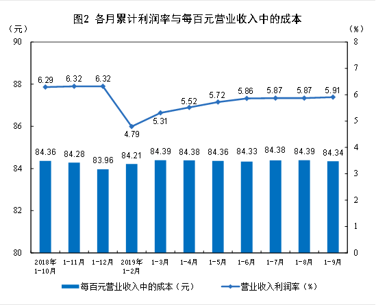 1—9月份,規(guī)模以上工業(yè)企業(yè)實(shí)現(xiàn)營(yíng)業(yè)收入77.67萬億元,同比增長(zhǎng)4.5%;發(fā)生營(yíng)業(yè)成本65.51萬億元,增長(zhǎng)4.8%;營(yíng)業(yè)收入利潤(rùn)率為5.91%,同比降低0.41個(gè)百分點(diǎn)。