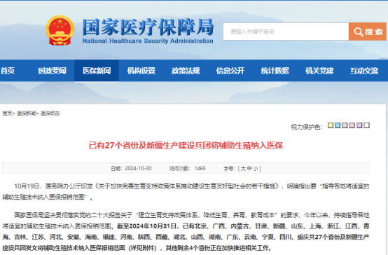 截至2024年10月31日,已有27個(gè)省份及新疆生產(chǎn)建設(shè)兵團(tuán)發(fā)文將輔助生殖技術(shù)納入醫(yī)保報(bào)銷范圍